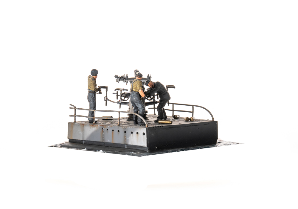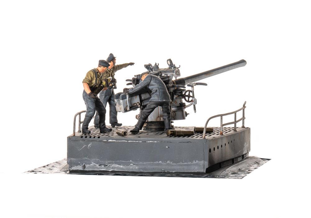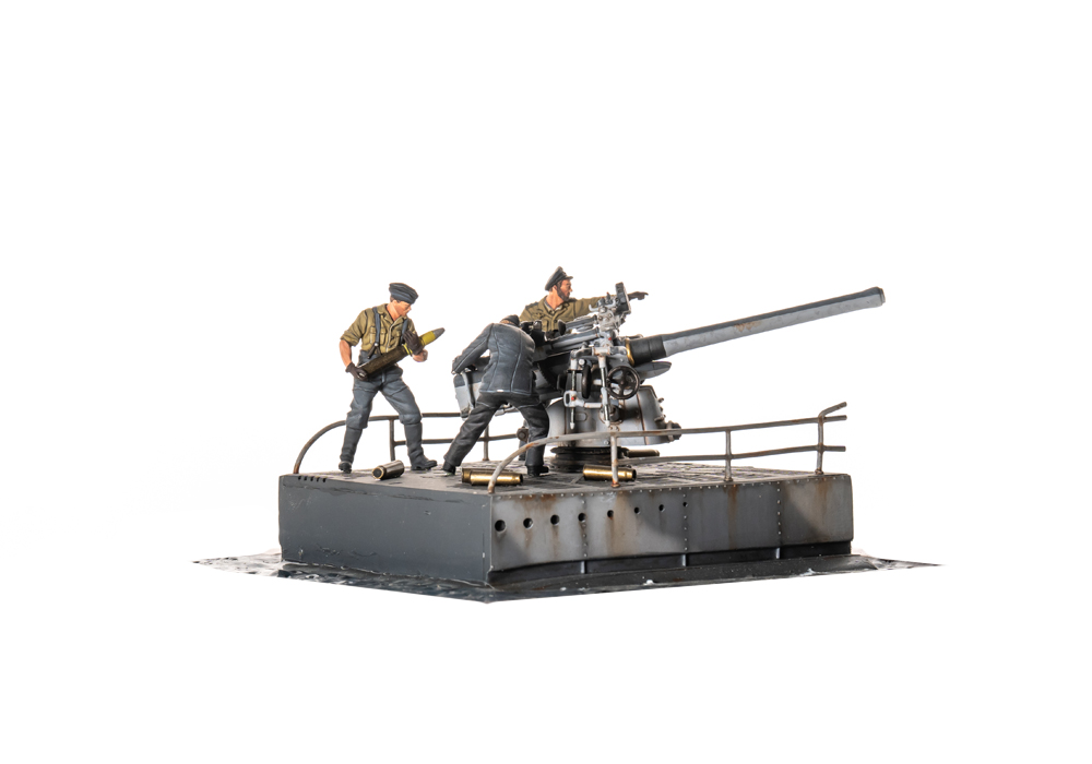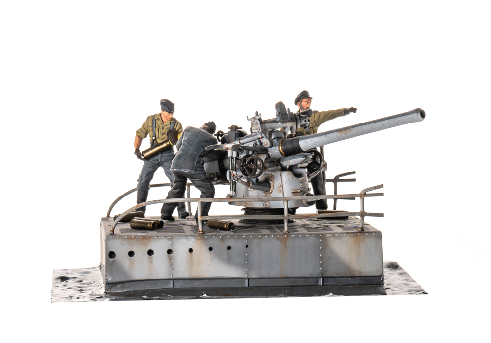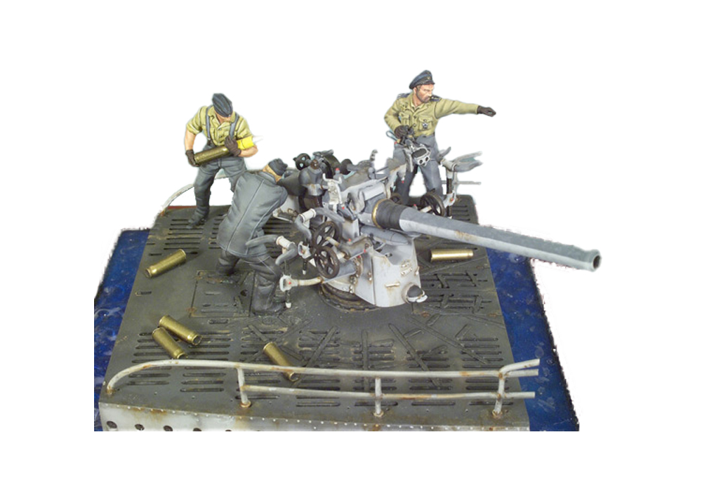 El legendario cañón de cubierta U-Boat VII C y Tripulación. Kit para montar y pintar con metal blanco y resina. Compatible con S5-S09 (U-Boat VII C Torre). 65 piezas de metal, 5 de resina y 3 figuras en 54mm.