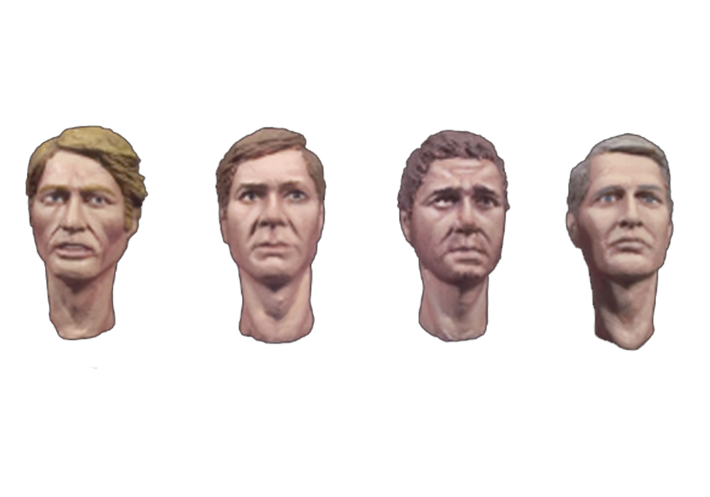 Cuatro cabezas tipo en metal blanco.